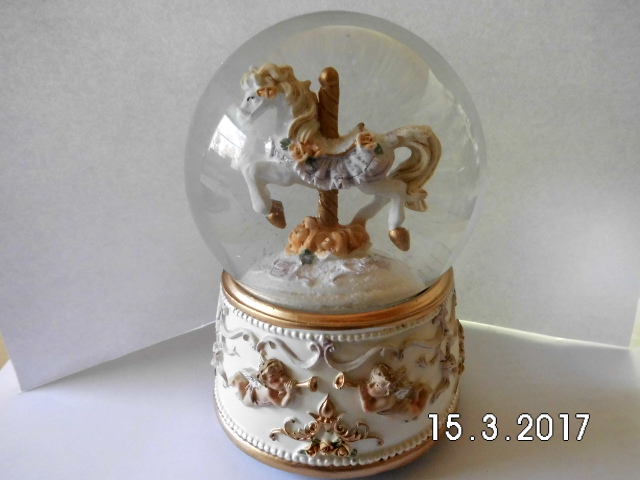 The music box with a height of approx. 15 cm and a width of approx. 10 cm is made of artificial sand (polyresin); the transparent part made of glass. The music box is wound at the bottom.